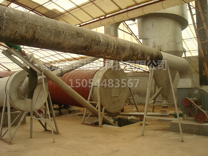 鋸末烘干機:包括熱風爐、進料口、旋轉筒、過濾筒、物料輸送管、冷卻筒和出料口;其中旋轉筒位于主動滾輪上,主動滾輪靠電機及減速傳動帶動旋轉筒低速轉動,生熱爐與旋轉筒之間設有進料口,旋轉筒內設有翻炒葉片,在旋轉筒與過濾筒相連處設有擋板,擋板上開有一小孔,過濾筒一端與旋轉筒相連,另一端與物料輸送管相連,過濾筒內設有擋塊,過濾筒的底部設有排渣孔,冷卻筒一端通過鼓風機與物料輸送管相連,另一端與出料口相連。由于采用上述結構,所以鋸末能在旋轉筒內充分干燥,且鋸末在進入物料輸送管前再次充分散開,使水分蒸發快,擋塊可將鋸末中的雜質擋住,###進入物料輸送管中鋸末的質量。鋸末進入鋸末烘干機內由噴吹管與回轉筒體共同作用,在筒內沸騰流化,熱風與物料充分觸,完成干燥。